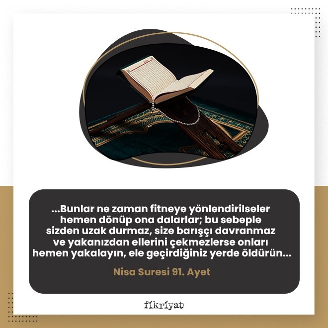 "Bunlardan başka hem sizden hem de kendi topluluklarından yana güvende olmak isteyen kimseleri de bulacaksınız. Bunlar ne zaman fitneye yönlendirilseler hemen dönüp ona dalarlar; bu sebeple sizden uzak durmaz, size barışçı davranmaz ve yakanızdan ellerini çekmezlerse onları hemen yakalayın, ele geçirdiğiniz yerde öldürün. İşte onlar hakkında size apaçık bir yetki vermiş olduk." (Nisa Suresi, 91. ayet)