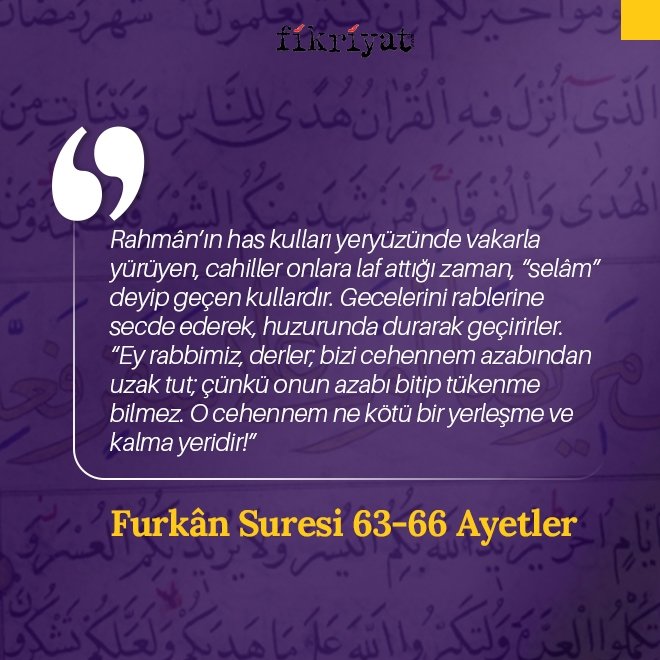 Rahmân'ın has kulları yeryüzünde vakarla yürüyen, cahiller onlara laf attığı zaman, "selâm" deyip geçen kullardır. Gecelerini rablerine secde ederek, huzurunda durarak geçirirler. "Ey rabbimiz, derler; bizi cehennem azabından uzak tut; çünkü onun azabı bitip tükenme bilmez. O cehennem ne kötü bir yerleşme ve kalma yeridir!"