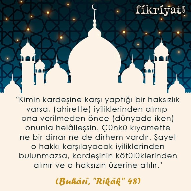 "Kimin kardeşine karşı yaptığı bir haksızlık varsa, (ahirette) iyiliklerinden alınıp ona verilmeden önce (dünyada iken) onunla helâlleşsin. Çünkü kıyamette ne bir dinar ne de dirhem vardır. Şayet o hakkı karşılayacak iyiliklerinden bulunmazsa, kardeşinin kötülüklerinden alınır ve o haksızın üzerine atılır."