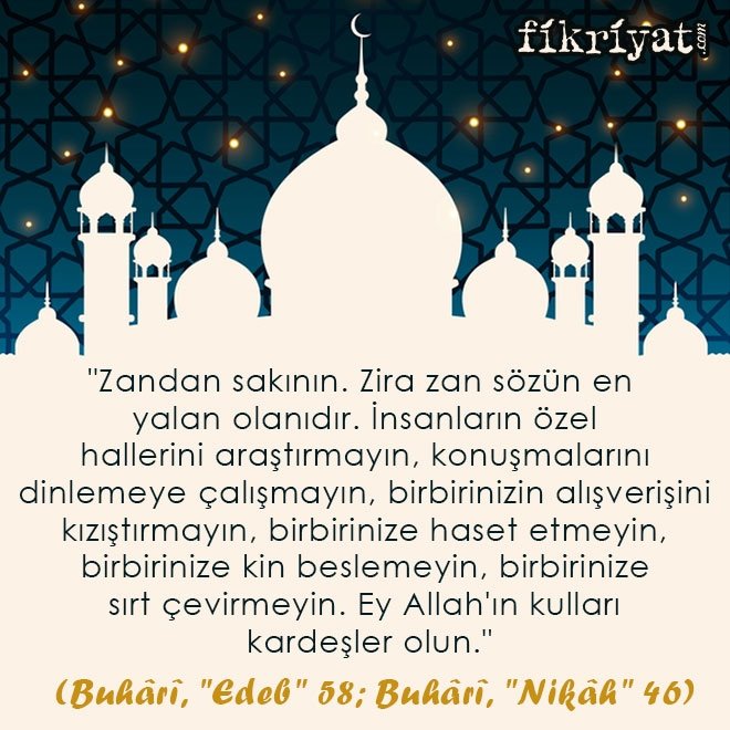"Zandan sakının. Zira zan sözün en yalan olanıdır. İnsanların özel hallerini araştırmayın, konuşmalarını dinlemeye çalışmayın, birbirinizin alışverişini kızıştırmayın, birbirinize haset etmeyin, birbirinize kin beslemeyin, birbirinize sırt çevirmeyin. Ey Allah'ın kulları kardeşler olun."