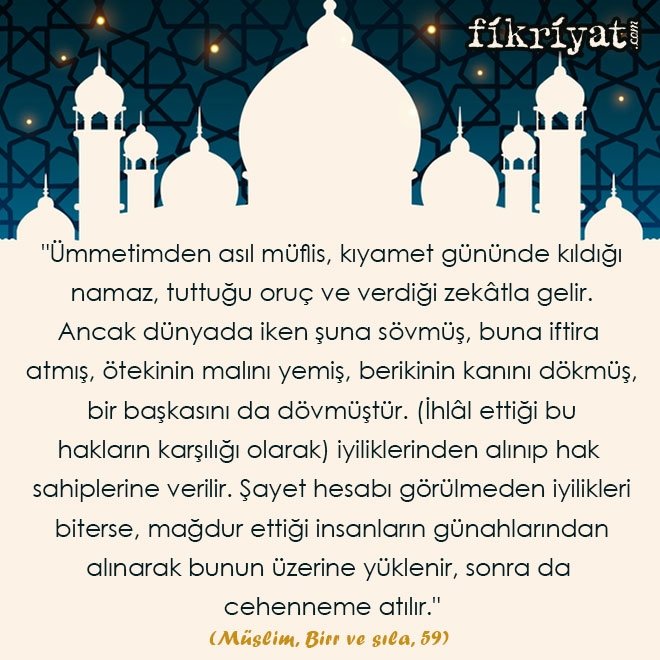 "Ümmetimden asıl müflis, kıyamet gününde kıldığı namaz, tuttuğu oruç ve verdiği zekâtla gelir. Ancak dünyada iken şuna sövmüş, buna iftira atmış, ötekinin malını yemiş, berikinin kanını dökmüş, bir başkasını da dövmüştür. (İhlâl ettiği bu hakların karşılığı olarak) iyiliklerinden alınıp hak sahiplerine verilir. Şayet hesabı görülmeden iyilikleri biterse, mağdur ettiği insanların günahlarından alınarak bunun üzerine yüklenir, sonra da cehenneme atılır."