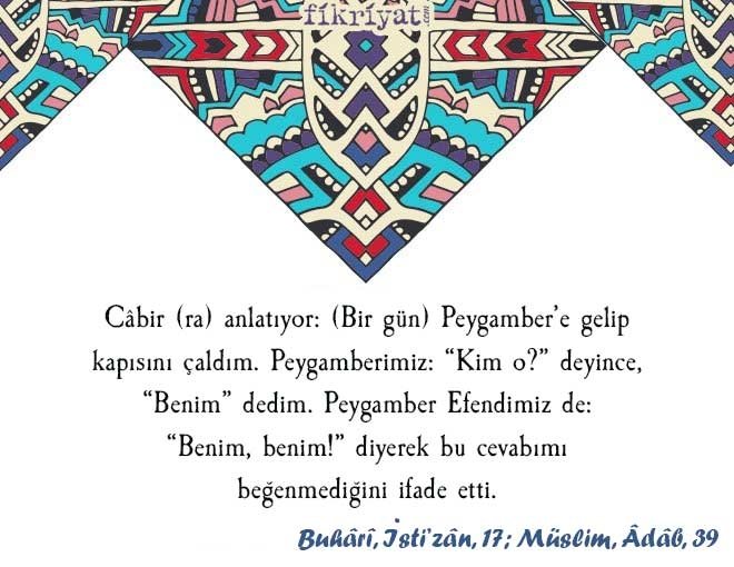 ◾ Câbir (ra) anlatıyor: (Bir gün) Peygamber'e gelip kapısını çaldım. Peygamberimiz: "Kim o?" deyince, "Benim" dedim. Peygamber Efendimiz de: "Benim, benim!" diyerek bu cevabımı beğenmediğini ifade etti.