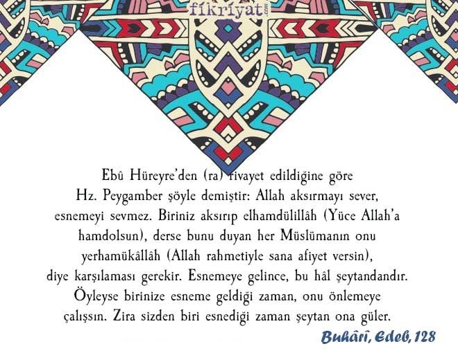 ◾ Ebû Hüreyre'den (ra) rivayet edildiğine göre Hz. Peygamber şöyle demiştir: Allah aksırmayı sever, esnemeyi sevmez. Biriniz aksırıp elhamdülillâh (Yüce Allah'a hamdolsun), derse bunu duyan her Müslümanın onu yerhamükâllâh (Allah rahmetiyle sana afiyet versin), diye karşılaması gerekir. Esnemeye gelince, bu hâl şeytandandır. Öyleyse birinize esneme geldiği zaman, onu önlemeye çalışsın. Zira sizden biri esnediği zaman şeytan ona güler.