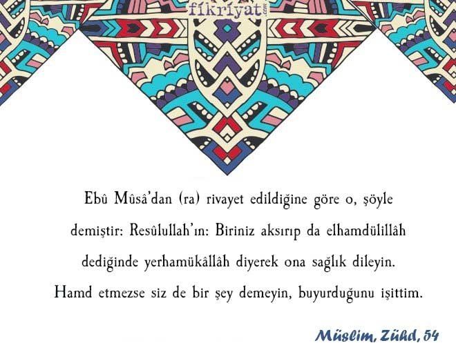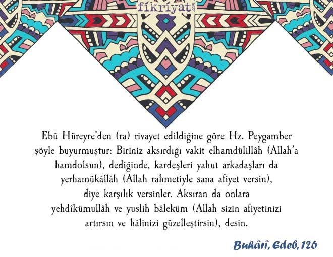 ◾ Ebû Hüreyre'den (ra) rivayet edildiğine göre Hz. Peygamber şöyle buyurmuştur: Biriniz aksırdığı vakit elhamdülillâh (Allah'a hamdolsun), dediğinde, kardeşleri yahut arkadaşları da yerhamükâllâh (Allah rahmetiyle sana afiyet versin), diye karşılık versinler. Aksıran da onlara yehdîkümullâh ve yuslih bâleküm (Allah sizin afiyetinizi artırsın ve hâlinizi güzelleştirsin), desin.
