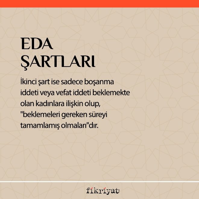 ◾ İkinci şart ise sadece boşanma iddeti veya vefat iddeti beklemekte olan kadınlara ilişkin olup, "beklemeleri gereken süreyi tamamlamış olmaları"dır. Hanefî mezhebine göre eda şartı olan bu durum diğer mezheplere göre yükümlülük şartıdır.
