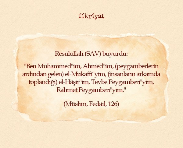 ◾ Allah Resulü bazı hadis-i şerfilerde isim ve sıfatlarından bahsetmiş, bu hususlarda Ashab-ı Kiram'ı bilgilendirmişti. Bunlardan en bilinenleri Muhammed, Ahmed, el-Mâhî, el-Hâşir, el-Âkıb idi.