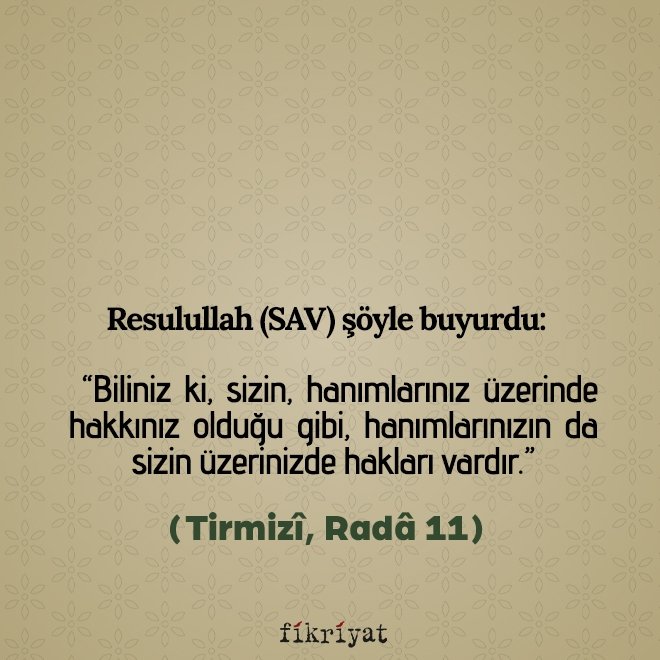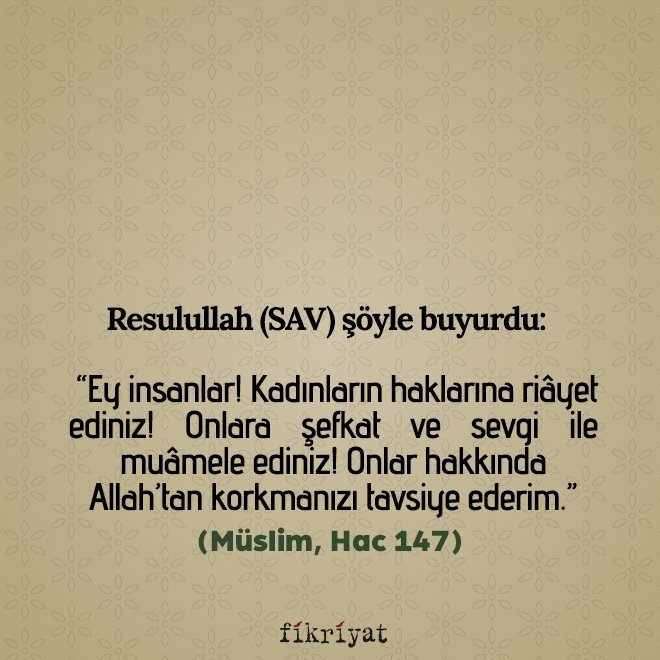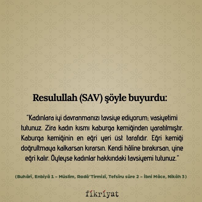 "Kadınlara iyi davranmanızı tavsiye ediyorum; vasiyetimi tutunuz. Zira kadın kısmı kaburga kemiğinden yaratılmıştır. Kaburga kemiğinin en eğri yeri üst tarafıdır. Eğri kemiği doğrultmaya kalkarsan kırarsın. Kendi hâline bırakırsan, yine eğri kalır. Öyleyse kadınlar hakkındaki tavsiyemi tutunuz."