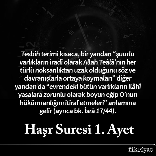 ◼ Tesbih terimi kısaca, bir yandan "şuurlu varlıkların iradî olarak Allah Teâlâ'nın her türlü noksanlıktan uzak olduğunu söz ve davranışlarla ortaya koymaları" diğer yandan da "evrendeki bütün varlıkların ilâhî yasalara zorunlu olarak boyun eğip O'nun hükümranlığını itiraf etmeleri" anlamına gelir (ayrıca bk. İsrâ 17/44).