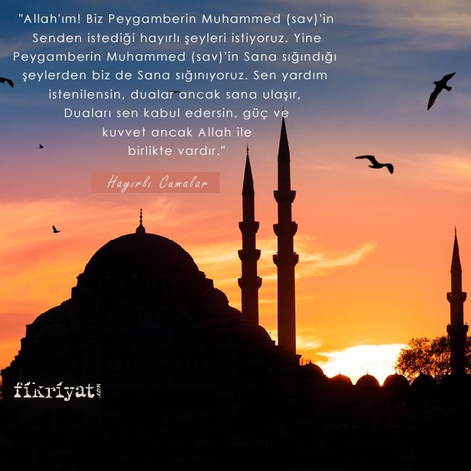 "Allah'ım! Biz Peygamberin Muhammed (sav)'in Senden istediği hayırlı şeyleri istiyoruz. Yine Peygamberin Muhammed (sav)'in Sana sığındığı şeylerden biz de Sana sığınıyoruz. Sen yardım istenilensin, dualar ancak sana ulaşır, duaları sen kabul edersin, güç ve kuvvet ancak Allah ile birlikte vardır."