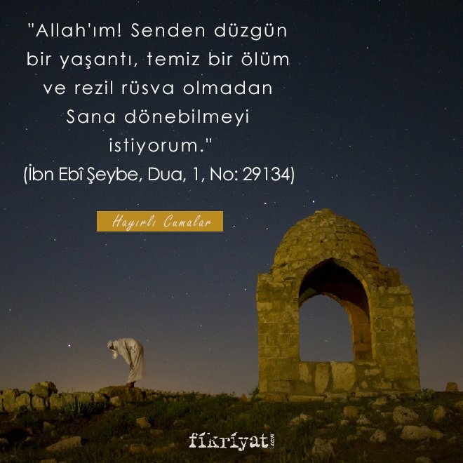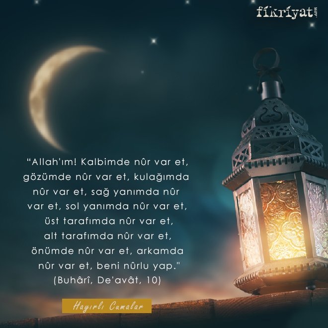 "Allah'ım! Kalbimde nûr var et, gözümde nûr var et, kulağımda nûr var et, sağ yanımda nûr var et, sol yanımda nûr var et, üst tarafımda nûr var et, alt tarafımda nûr var et, önümde nûr var et, arkamda nûr var et, beni nûrlu yap."