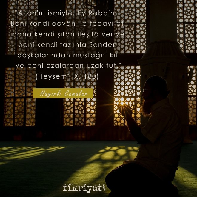 "Allah'ın ismiyle. Ey Rabbim! Beni kendi devân ile tedavi et, bana kendi şifân ile şifâ ver ve beni kendi fazlınla Senden başkalarından müstağni kıl ve beni ezalardan uzak tut."
