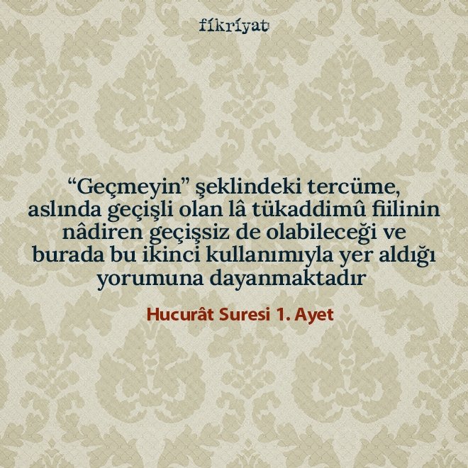 "Geçmeyin" şeklindeki tercüme, aslında geçişli olan lâ tükaddimû fiilinin nâdiren geçişsiz de olabileceği ve burada bu ikinci kullanımıyla yer aldığı yorumuna dayanmaktadır (bk. Şevkânî, V, 68). Bazı kıraatlerde bu kelime, "geçmeyin" anlamında lâ tekaddemû şeklinde de okunmuştur. Ancak kelimenin geçişli okunuşuna dayanan diğer yorumları da kapsayacak şekilde bunu "geçmeyin (başkalarını da geçirmeyin)" şeklinde anlamak yerinde olacaktır.