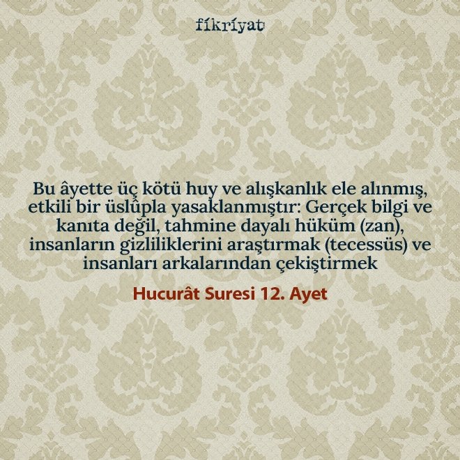 ﴾12﴿ Ey iman edenler! Zannın çoğundan sakının; çünkü bazı zanlar günahtır. Gizlilikleri araştırmayın, birbirinizin gıybetini yapmayın; herhangi biriniz, ölmüş kardeşinin etini yemekten hoşlanır mı? Tabii ki bundan tiksindiniz! Allah'a itaatsizlikten de sakının. Allah tövbeleri çokça kabul etmektedir, rahmeti sonsuzdur.
