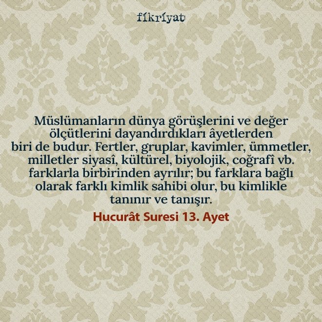 Müslümanların dünya görüşlerini ve değer ölçütlerini dayandırdıkları âyetlerden biri de budur. Fertler, gruplar, kavimler, ümmetler, milletler siyasî, kültürel, biyolojik, coğrafî vb. farklarla birbirinden ayrılır; bu farklara bağlı olarak farklı kimlik sahibi olur, bu kimlikle tanınır ve tanışır.
