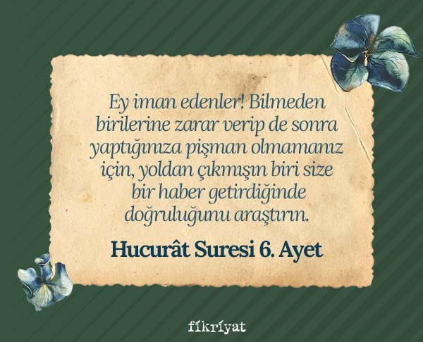 - 6. Ayet: "yoldan çıkmışın biri size bir haber getirdiğinde doğruluğunu araştırın"