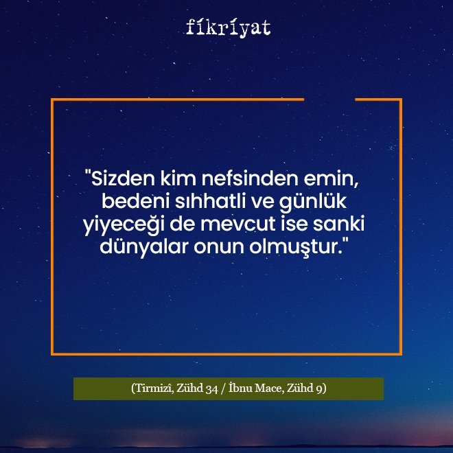 "Sizden kim nefsinden emin, bedeni sıhhatli ve günlük yiyeceği de mevcut ise sanki dünyalar onun olmuştur."