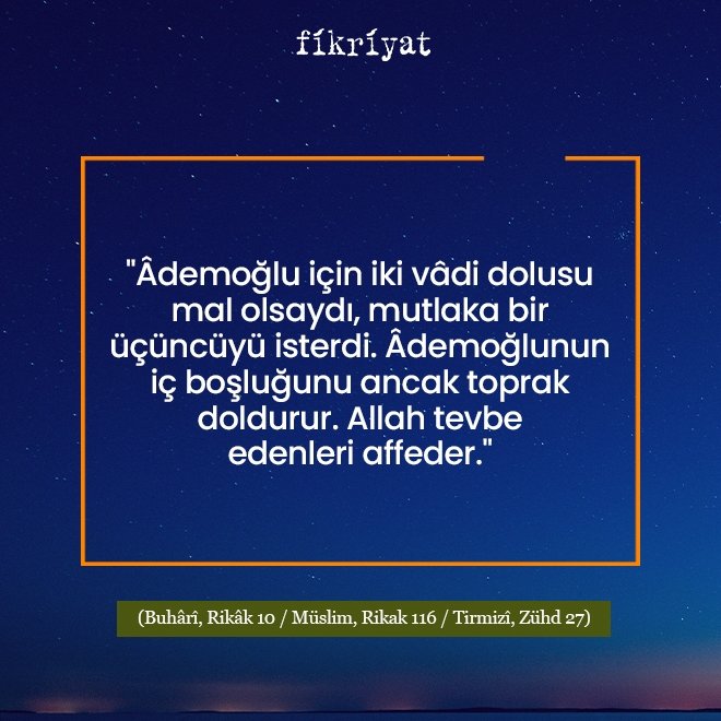 "Âdemoğlu için iki vâdi dolusu mal olsaydı, mutlaka bir üçüncüyü isterdi. Âdemoğlunun iç boşluğunu ancak toprak doldurur. Allah tevbe edenleri affeder."