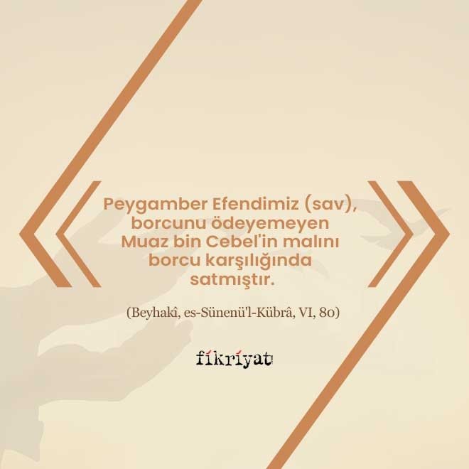 🔸 Peygamber Efendimiz (sav), borcunu ödeyemeyen Muaz bin Cebel'in malını borcu karşılığında satmıştır. (Beyhakî, es-Sünenü'l-Kübrâ, VI, 80)