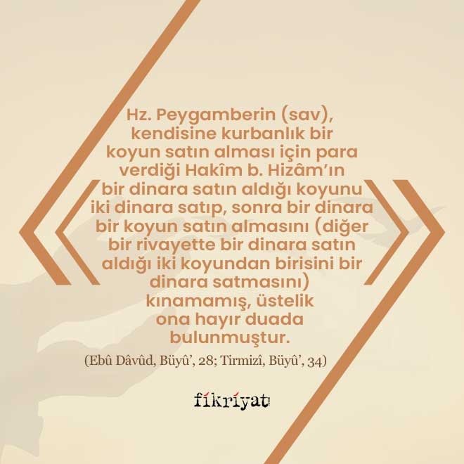🔸 Hz. Peygamberin (sav), kendisine kurbanlık bir koyun satın alması için para verdiği Hakîm b. Hizâm'ın bir dinara satın aldığı koyunu iki dinara satıp, sonra bir dinara bir koyun satın almasını (diğer bir rivayette bir dinara satın aldığı iki koyundan birisini bir dinara satmasını) kınamamış, üstelik ona hayır duada bulunmuştur (Ebû Dâvûd, Büyû', 28; Tirmizî, Büyû', 34).
