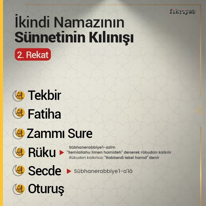 🔷 2. rekata kalkınca kıyamda iken Besmele çekilir ve Fatiha Suresi okunur. Fatiha'dan sonra bir zammı sure okunur. Surenin ardından "Allahu Ekber" diyerek rükuya gidilir ve üç defa "Sübhâne Rabbiye'l-azim" denir.