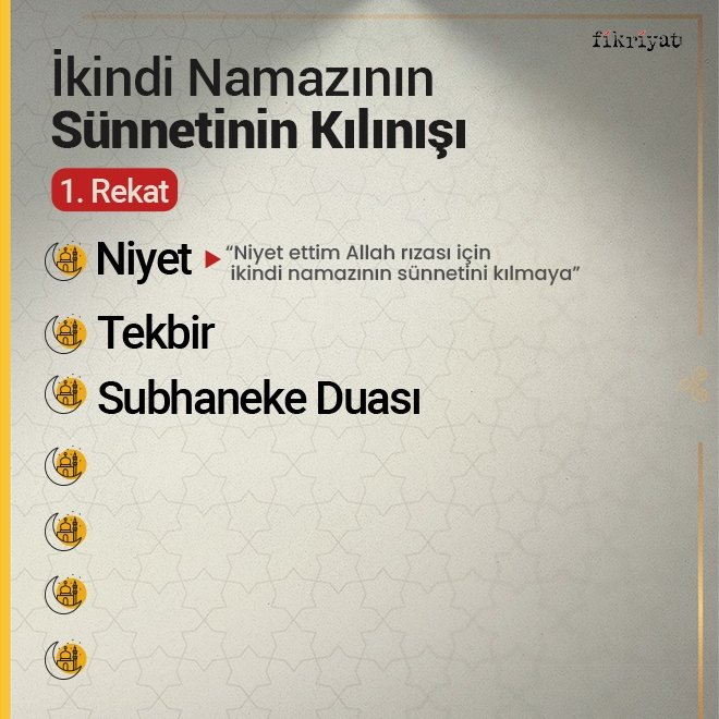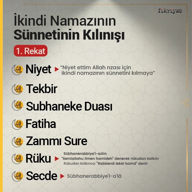 🔷 Namaza başlamadan önce abdest alınır. Namazı ikame edecek temiz bir yerde kıbleye dönerek hazır hale gelinir. İkindi namazının sünneti dört rekattır ve farzdan önce kılınır.