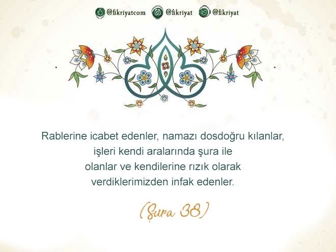 🔸 Rablerine icabet edenler, namazı dosdoğru kılanlar, işleri kendi aralarında şura ile olanlar ve kendilerine rızık olarak verdiklerimizden infak edenler.