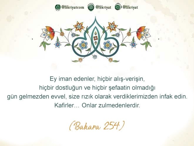 🔸 Ey iman edenler, hiçbir alış-verişin, hiçbir dostluğun ve hiçbir şefaatin olmadığı gün gelmezden evvel, size rızık olarak verdiklerimizden infak edin. Kafirler… Onlar zulmedenlerdir.