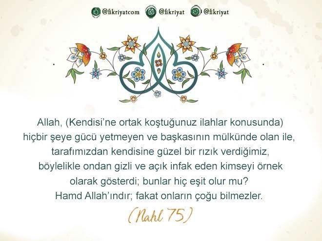 🔸 Allah, (Kendisi'ne ortak koştuğunuz ilahlar konusunda) hiçbir şeye gücü yetmeyen ve başkasının mülkünde olan ile, tarafımızdan kendisine güzel bir rızık verdiğimiz, böylelikle ondan gizli ve açık infak eden kimseyi örnek olarak gösterdi; bunlar hiç eşit olur mu? Hamd Allah'ındır; fakat onların çoğu bilmezler.