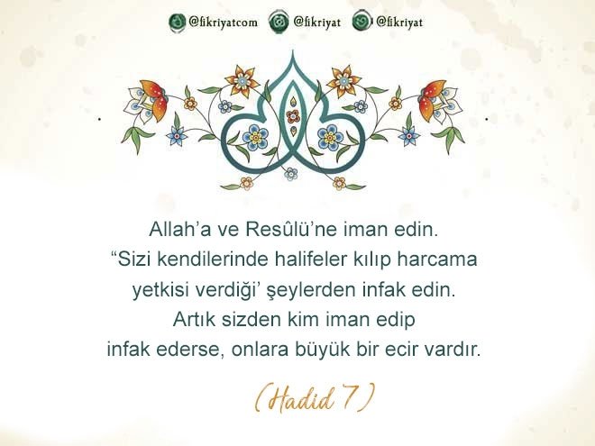 🔸 Allah'a ve Resûlü'ne iman edin. "Sizi kendilerinde halifeler kılıp harcama yetkisi verdiği' şeylerden infak edin. Artık sizden kim iman edip infak ederse, onlara büyük bir ecir vardır.