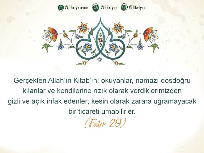 🔸 Gerçekten Allah'ın Kitab'ını okuyanlar, namazı dosdoğru kılanlar ve kendilerine rızık olarak verdiklerimizden gizli ve açık infak edenler; kesin olarak zarara uğramayacak bir ticareti umabilirler.