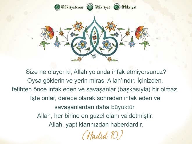 🔸 Size ne oluyor ki, Allah yolunda infak etmiyorsunuz? Oysa göklerin ve yerin mirası Allah'ındır. İçinizden, fetihten önce infak eden ve savaşanlar (başkasıyla) bir olmaz. İşte onlar, derece olarak sonradan infak eden ve savaşanlardan daha büyüktür. Allah, her birine en güzel olanı va'detmiştir. Allah, yaptıklarınızdan haberdardır.