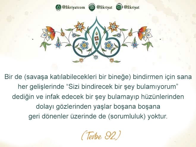 🔸 Bir de (savaşa katılabilecekleri bir bineğe) bindirmen için sana her gelişlerinde "Sizi bindirecek bir şey bulamıyorum" dediğin ve infak edecek bir şey bulamayıp hüzünlerinden dolayı gözlerinden yaşlar boşana boşana geri dönenler üzerinde de (sorumluluk) yoktur.