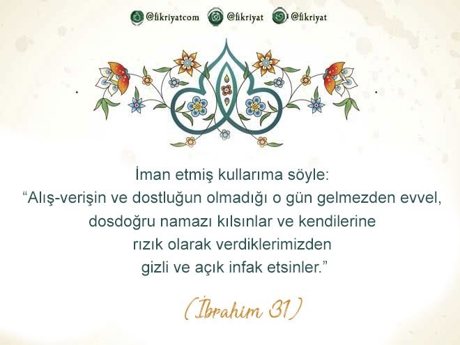 🔸 İman etmiş kullarıma söyle: "Alış-verişin ve dostluğun olmadığı o gün gelmezden evvel, dosdoğru namazı kılsınlar ve kendilerine rızık olarak verdiklerimizden gizli ve açık infak etsinler."
