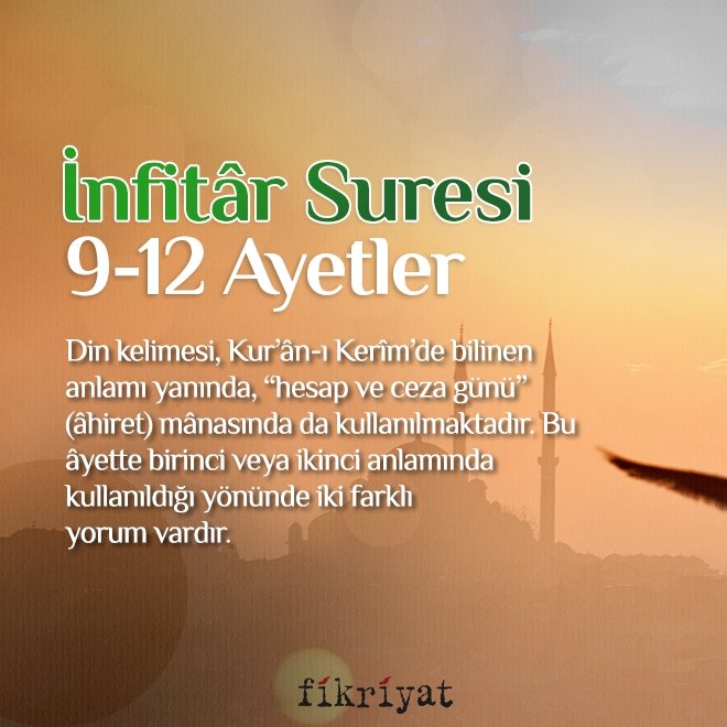 ➡ Din kelimesi, Kur'ân-ı Kerîm'de bilinen anlamı yanında, "hesap ve ceza günü" (âhiret) mânasında da kullanılmaktadır. Bu âyette birinci veya ikinci anlamında kullanıldığı yönünde iki farklı yorum vardır. Ancak müteakip âyetler ikinci yorumu desteklemektedir. Buna göre 10-12. âyetler şu gerçeği ortaya koymaktadır: Bu dünyada insanlar başı boş bırakılmamıştır. Aksine herkesin neler yaptığını bilen ve kayda geçen görevli melekler vardır.