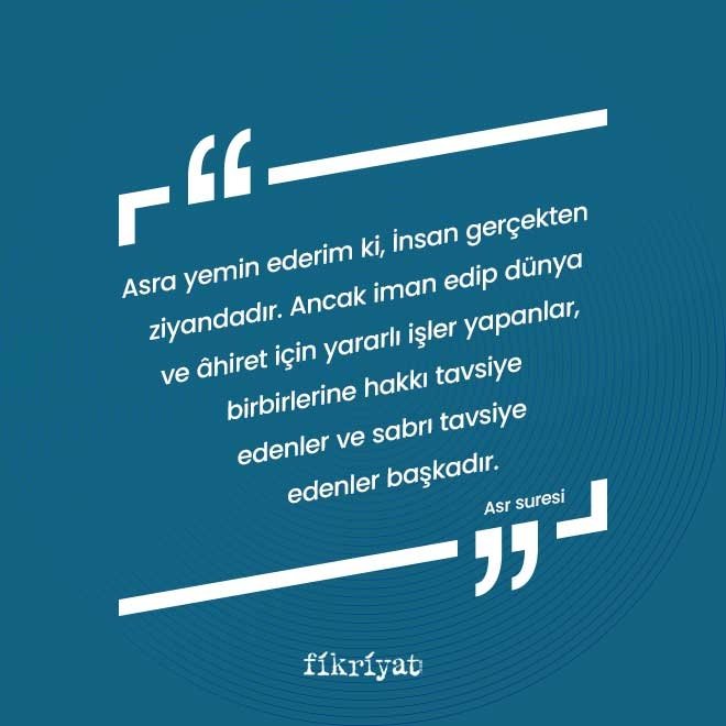 "Asra yemin ederim ki, İnsan gerçekten ziyandadır. Ancak iman edip dünya ve âhiret için yararlı işler yapanlar, birbirlerine hakkı tavsiye edenler ve sabrı tavsiye edenler başkadır."