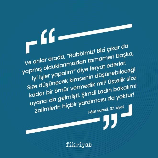Ve onlar orada, "Rabbimiz! Bizi çıkar da yapmış olduklarımızdan tamamen başka, iyi işler yapalım" diye feryat ederler. Size düşünecek kimsenin düşünebileceği kadar bir ömür vermedik mi? Üstelik size uyarıcı da gelmişti. Şimdi tadın bakalım! Zalimlerin hiçbir yardımcısı da yoktur! (Fâtır suresi, 37. ayet)