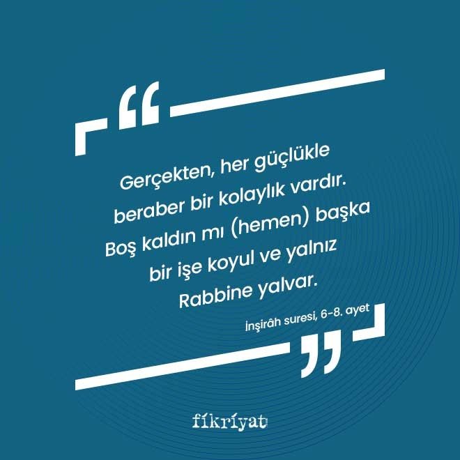 "Gerçekten, her güçlükle beraber bir kolaylık vardır. Boş kaldın mı (hemen) başka bir işe koyul ve yalnız Rabbine yalvar." (İnşirâh suresi, 6-8. ayet)