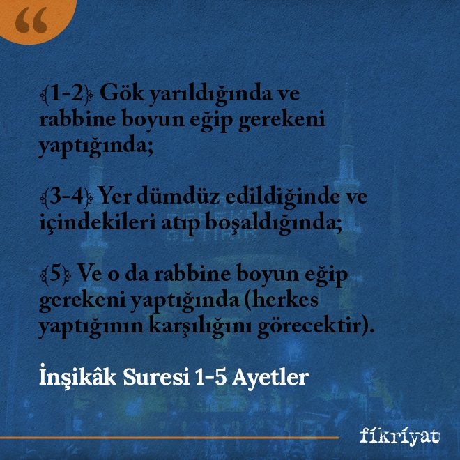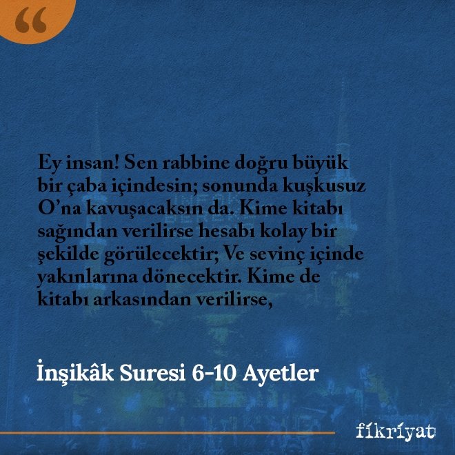 ◼ Ey insan! Sen rabbine doğru büyük bir çaba içindesin; sonunda kuşkusuz O'na kavuşacaksın da. Kime kitabı sağından verilirse hesabı kolay bir şekilde görülecektir; Ve sevinç içinde yakınlarına dönecektir. Kime de kitabı arkasından verilirse.