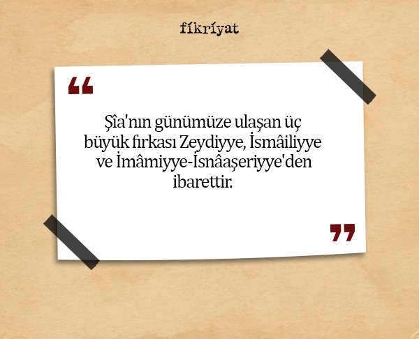 ◾ Şîa'nın günümüze ulaşan üç büyük fırkası Zeydiyye, İsmâiliyye ve İmâmiyye-İsnâaşeriyye'den ibarettir. Zeydiyye Hz. Ali'nin torunu Zeyd b. Ali Zeynelâbidîn'e nisbet edildiği için bu ismi alır. Günümüzde Yemen bölgesinde taraftarları bulunan Zeydiyye itikadî konularda Mu'tezile mezhebine, fıkıh sahasında ise Hanefî mezhebine yakın görüşlere sahiptir. Şîa içindeki en mûtedil fırka olan Zeydîler, hilâfetin Hz. Ali'nin ve soyundan gelenlerin hakkı olduğuna inanmakla birlikte, Hz. Ebû Bekir ve Hz. Ömer'in hilâfetini de meşrû görürler. Hilâfetin Hüseyinoğulları'na ait olduğu ve devlet başkanının mâsum olduğu fikrini de kabul etmezler.