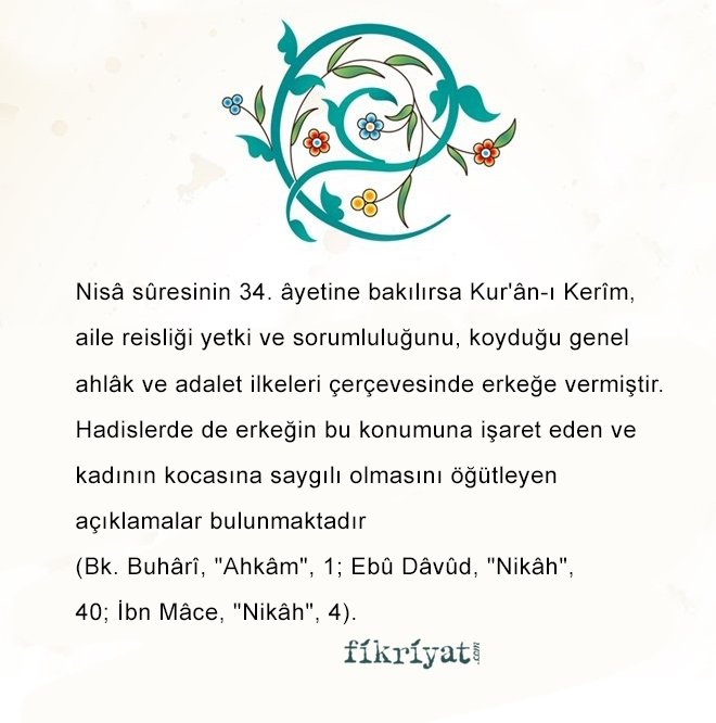 Nisâ sûresinin 34. âyetine bakılırsa Kur'ân-ı Kerîm, aile reisliği yetki ve sorumluluğunu, koyduğu genel ahlâk ve adalet ilkeleri çerçevesinde erkeğe vermiştir. Hadislerde de erkeğin bu konumuna işaret eden ve kadının kocasına saygılı olmasını öğütleyen açıklamalar bulunmaktadır.