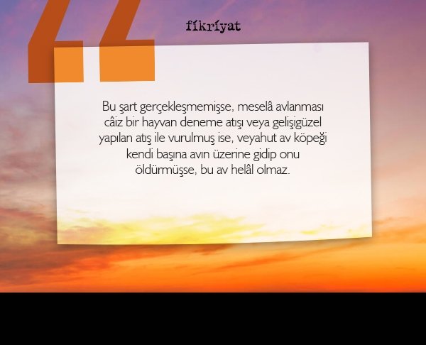 ◾ Fakihler bu şartlardan bazılarında fikir birliği etmişler, bazılarında ise delil farklılığı sebebiyle farklı sonuçlara ulaşmışlardır. Bu itibarla avlanacak ve av hayvanlarından yararlanacak şahısların fıkıh kültüründeki bu hükümleri bilmesi gerekir. Avlama yoluyla elde edilen bir hayvanın etini yemenin helâl olması için bazı şartlar vardır. Bunları üç grupta toplamak mümkündür.