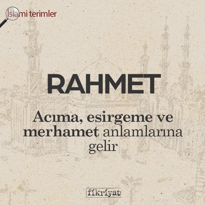 ◾ Arapça kökenli "rahmet" kelimesi "acıma, esirgeme ve merhamet" anlamlarına gelir. Rahmet sözcüğü, İslami bir terim olarak "Yüce Allah'ın (CC) kullarına merhamet etmesi" manasında kullanılmaktadır.