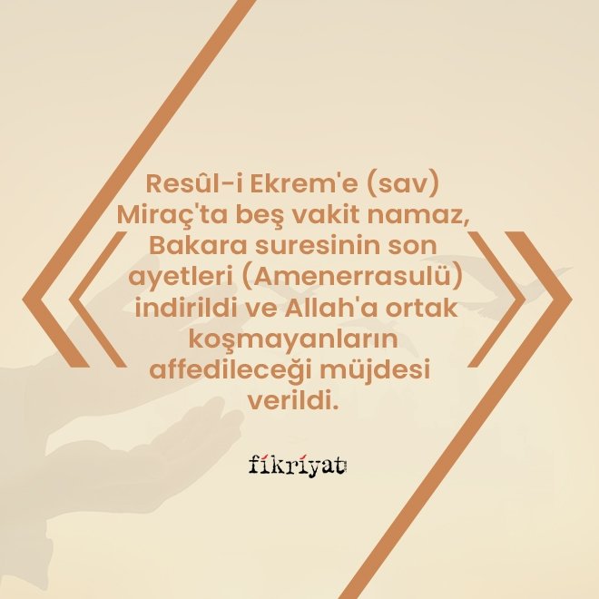 ◾ Hz. Peygambere, Miraç'ta üç şey verildi: Beş vakit namaz, Bakara suresinin son ayetleri ve Allah'a ortak koşmayanların affedileceği ve cennete girebilecek olmasıydı.