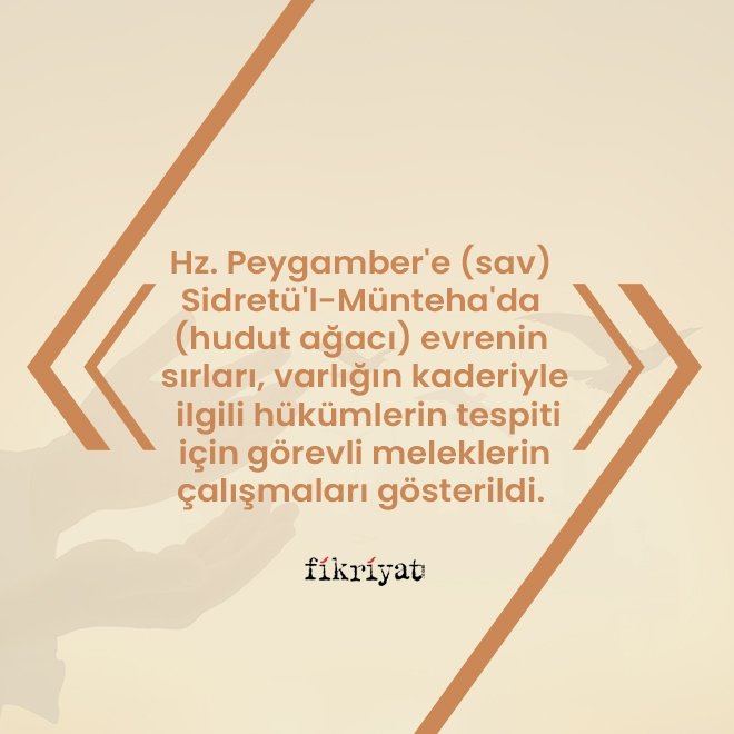 ◾ Hz. Peygamber'e (sav) Sidretü'l-Münteha'da (hudut ağacı) evrenin sırları, varlığın kaderiyle ilgili hükümlerin tespiti için görevli meleklerin çalışmaları gösterildi. Cebrail (as) buradan ileri geçemeyeceğini bildirdi. Cebrail (as), "Bir parmak ucu daha öteye yaklaşmış olsaydım yakılırdım" dedi.