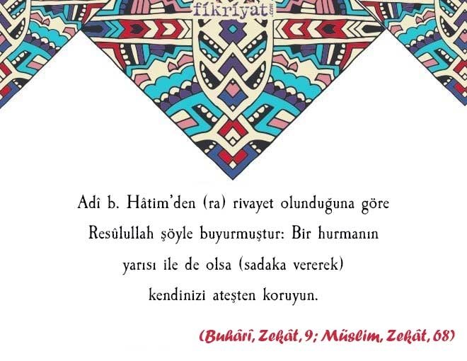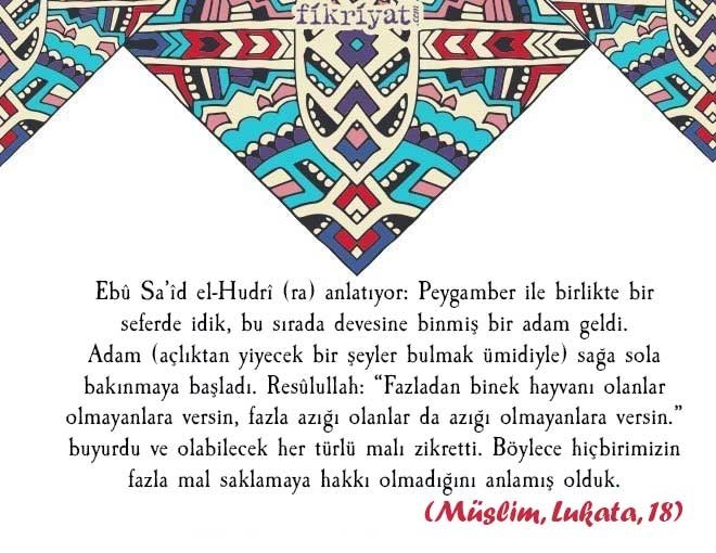 Ebû Sa'îd el-Hudrî (ra) anlatıyor: Peygamber ile birlikte bir seferde idik, bu sırada devesine binmiş bir adam geldi. Adam (açlıktan yiyecek bir şeyler bulmak ümidiyle) sağa sola bakınmaya başladı. Resûlullah: "Fazladan binek hayvanı olanlar olmayanlara versin, fazla azığı olanlar da azığı olmayanlara versin." buyurdu ve olabilecek her türlü malı zikretti. Böylece hiçbirimizin fazla mal saklamaya hakkı olmadığını anlamış olduk.