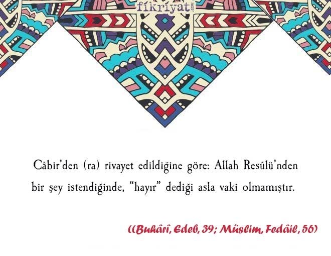 Sehl b. Sa'd (ra) anlatıyor: Bir kadın Resûlullah'a giysi getirdi. "Bunu kendi elimle size giydirmek için dokudum." dedi. (Bunun üzerine) Peygamber onu aldı, çünkü ona ihtiyacı vardı. Onu (belinden aşağı) sarındı ve yanımıza çıktı. Ashaptan biri: "Ne güzel giysi imiş, bana verir misiniz." dedi. Resûlullah: "Olur." buyurdu ve bir müddet oturduktan sonra evine gitti, o kumaşı dürüp, adama gönderdi. Sahabeler adama: "İyi yapmadın, Peygamber'in, ona ihtiyacı vardı ve o yüzden sarınmıştı. Hz. Peygamber'in kendisinden bir şey isteyeni boş çevirmediğini bildiğin hâlde ondan giysisini istedin." diyerek çıkıştılar. Adam: "Vallahi ben onu giyinmek için değil, kendime kefen yapmak için istedim." dedi. Sehl'in dediğine göre o kumaş, o adamın kefeni olmuş.