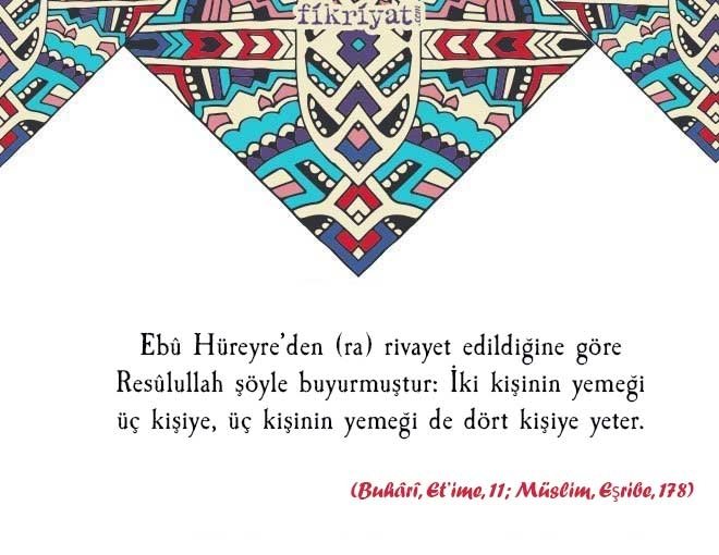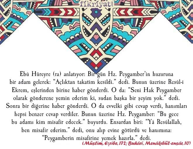 Ebû Hüreyre (ra) anlatıyor: Bir gün Hz. Peygamber'in huzuruna bir adam gelerek: "Açlıktan takatim kesildi." dedi. Bunun üzerine Resûl-i Ekrem, eşlerinden birine haber gönderdi. O da: "Seni Hak Peygamber olarak gönderene yemin ederim ki, sudan başka bir şeyim yok." dedi. Sonra bir diğerine haber gönderdi. O da evvelki gibi cevap verdi, hanımları hepsi benzer cevabı verdiler. Bunun üzerine Hz. Peygamber: "Bu gece bu adamı kim misafir edecek." buyurdu. Ensardan biri: "Yâ Resûlallah, ben misafir ederim." dedi, onu alıp evine götürdü ve hanımına: "Peygamberin misafirine yemek hazırla." dedi.