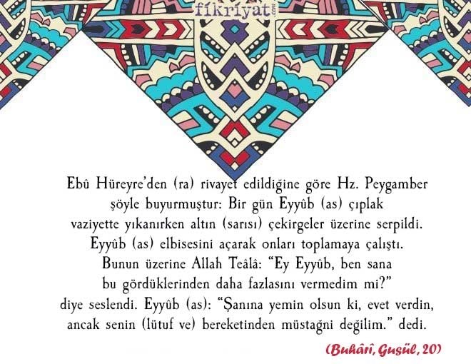 Ebû Hüreyre'den (ra) rivayet edildiğine göre Hz. Peygamber şöyle buyurmuştur: Bir gün Eyyûb (as) çıplak vaziyette yıkanırken altın (sarısı) çekirgeler üzerine serpildi. Eyyûb (as) elbisesini açarak onları toplamaya çalıştı. Bunun üzerine Allah Teâlâ: "Ey Eyyûb, ben sana bu gördüklerinden daha fazlasını vermedim mi?" diye seslendi. Eyyûb (as): "Şanına yemin olsun ki, evet verdin, ancak senin (lütuf ve) bereketinden müstağni değilim." dedi.