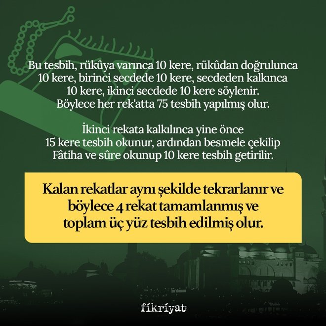 ▪ Böylece dört rekât namazda toplam 300 kere "Sübhânellâhi ve'l-hamdü lillâhi ve lâ ilâhe illellâhü vellâhü ekber" okunmuş olur.