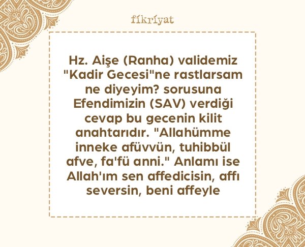 🔹 Hz. Aişe (Ranha) validemiz "Kadir Gecesi"ne rastlarsam ne diyeyim? sorusuna Efendimizin (SAV) verdiği cevap bu gecenin kilit anahtarıdır. "Allahümme inneke afüvvün, tuhibbül afve, fa'fü anni." Anlamı ise Allah'ım sen affedicisin, affı seversin, beni affeyle.